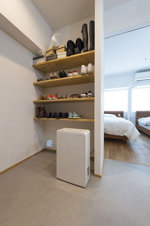 オープンなシューズクローゼット。下に寝室への「猫穴」がある