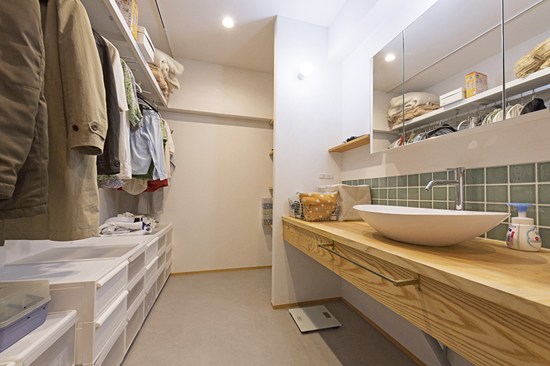 洗面室は個室にせずオープンに。背面には扉なしのファミリークローゼット