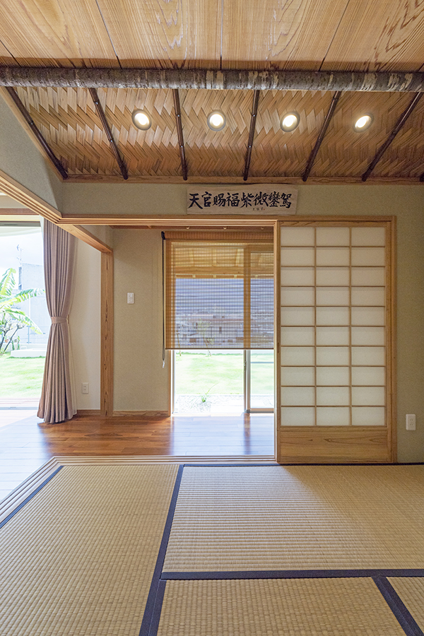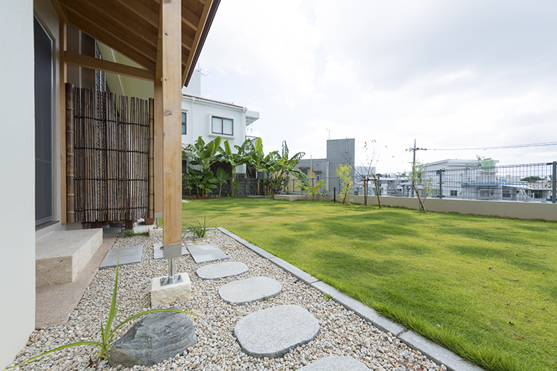 庭側には木屋根を組み、琉球石灰岩の沓脱(くつぬぎ)石と貴人口を設けた