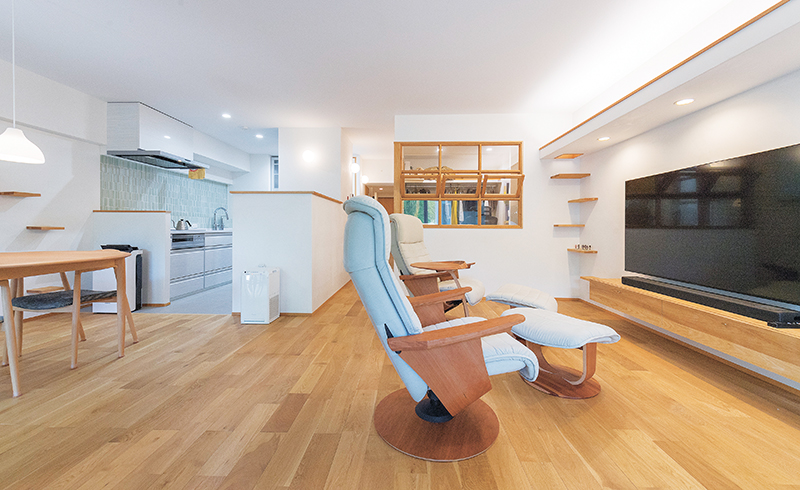 築50年の中古マンションを購入し、無垢(むく)材の床と漆喰(しっくい)壁で優しい雰囲気にリノベーションしたTさん宅。愛猫のためのキャットウオークやボックス、家具や建具もオリジナルで制作した。書斎は机や棚、木サッシの室内窓まで造作してもらい「使い勝手がいい」とTさん。テレビボードや洗面台なども木で造り付けて統一感のある空間となった。