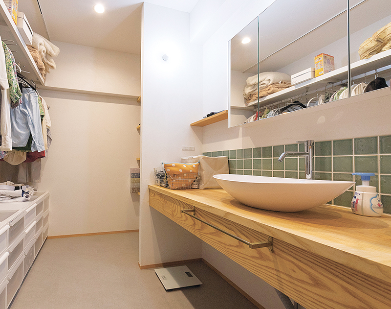洗面台の収納も造作。緑のタイルと相まってナチュラルな雰囲気