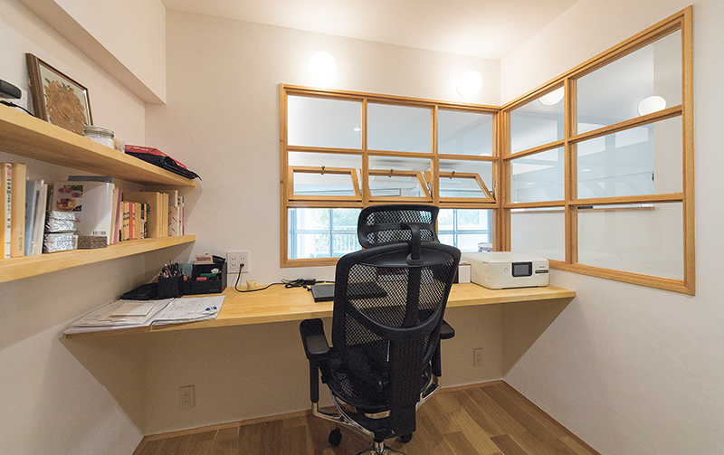 書斎は室内窓を通してLDKとつながる。デスクや棚を造作したほか、コンセントも多めに設置した