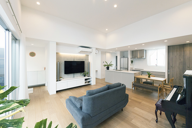 LDK 東側には、小上がりの和室と子ども室が並ぶ。リビングは天井高3.5メートル。長女が奏でるピアノの音が心地よく広がり、弾くのも聞くのも楽しい。高窓から見える空が、開放感をより高める