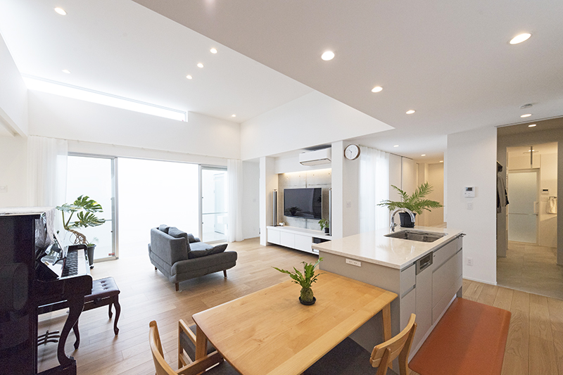 白とグレージュでまとめた、シンプルで明るい空間。キッチンに立つとリビングから中庭まで視線が抜け、家のほとんどが見渡せる。高窓越しに見える青空が、開放感とすがすがしさを高める。「南と東が開けた土地に出合えたのが、ラッキーでした」とMさん。住宅情報紙を見て憧れていた白い箱型のコートハウスは、「カーテンも窓も開けて過ごせるのがいい。建築士の提案で天井を高くしたリビングは、スピーカーにもこだわったので、家族で映画を見るのも楽しい」。