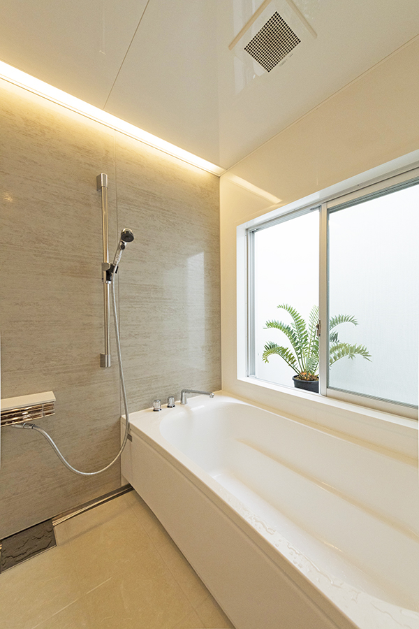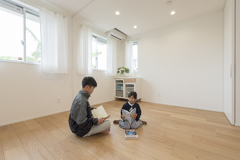 本島中部、国道から少し離れた静かな住宅地。家づくりは以前から考えていたが、土地がなく、実家近くでアパート暮らしをしていた。子どもたちを転校させたくない、と校区内で土地探しを続け、売り地が見つかった。理想の家を手掛ける建築士事務所に足を運び、「将来、子どもが家を建てることを想定し、土地の分け方から相談。丁寧なアドバイス、提案に安心感があり、設計を依頼しました」とMさん。