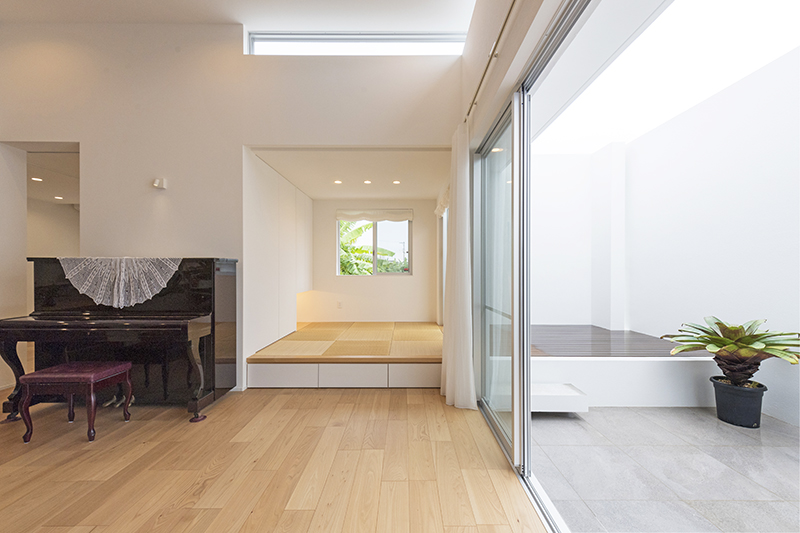 LDK 小上がりになった和室から中庭奥に見えるデッキまでは同じ高さでつながり、まるでステージのよう。Mさんお気に入りのスペースだ。和室下部は引き出し収納で、腰掛けるにも便利。和室脇にはピアノを置く計画で設計を進めた