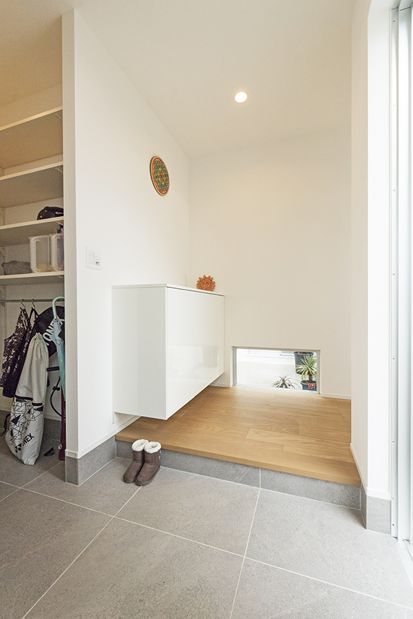 玄関 中庭との境をガラスにして明るく。正面の地窓奥はライトコート