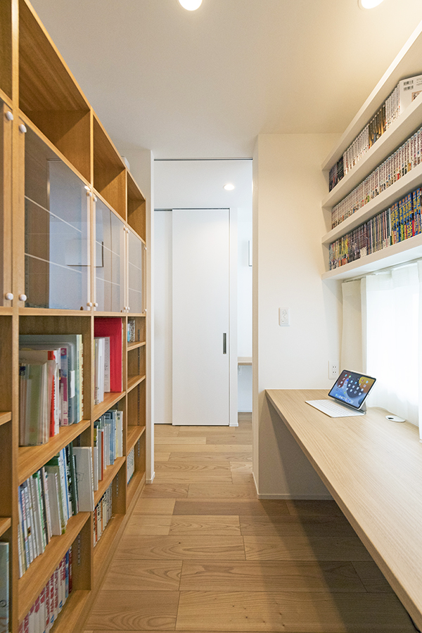 Mさんがどうしても譲れなかったのが、書斎。趣味のアイテムが整然と並ぶ癒やしの空間で、自分時間を楽しむ。