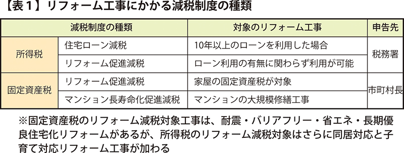 リフォーム工事の内容が一定の基準を満たし、かつ面積など家屋の要件を満たしていれば、確定申告することで所得税の控除が受けられます。また固定資産税の減額措置が受けられる場合もあります。ただし、いずれも所定の申告先に必要書類を期限内に申請する必要があります=表1。