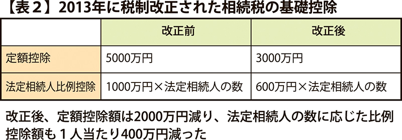 2013年の税制改正で相続税の基礎控除額が大きく削減され、これまで課税対象でなかった方も相続税対策が必要になっています=表2。