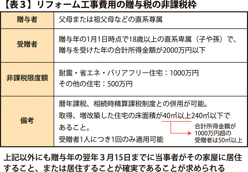 身内であっても年間110万円を超える贈与には贈与税が発生しますが、住宅取得資金には特例が設けられています。父母や祖父母など直系尊属から子や孫に贈与された住宅取得資金には、一定額まで税金が掛かりません。リフォーム費用も対象に含まれます。この非課税枠は来年12月31日までの予定で将来的には引き下げられる見込みのため、早めの活用が望まれます=表3。