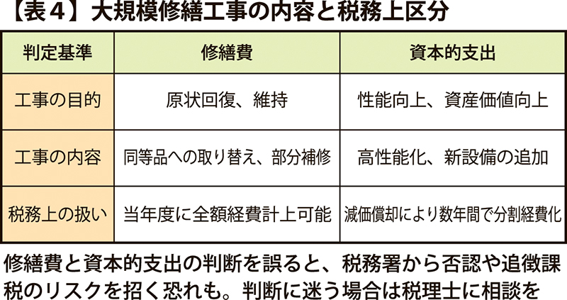 分譲マンションや賃貸アパートで実施される大規模修繕工事の費用に関する税務上の区分に、「修繕費」と「資本的支出」があります。修繕費とは建物や設備の原状回復や機能の維持を目的として支出される費用のこと。これらの工事は新たな価値を付加するものではないため単年度で経費として一括計上でき、結果として所得税や法人税の節税効果が高くなります。対して資本的支出とは建物の機能を向上させ、資産価値を高めることを目的とした支出で、耐震補強や高断熱窓取替工事などが該当します=表4。