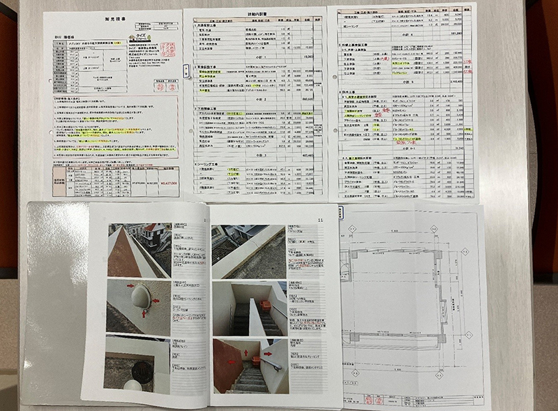 写真1 調査報告書では各部位写真とともに、劣化の原因と対策を詳細に解説。また、各階の現況図面を作成し、部位ごとに正確な積算を行う。見積書は調査結果から決定した仕様書に基づき、工法や使用材料を明記することで、金額の根拠を明確にしている