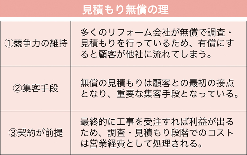報告書・見積書を作成するには、建物の現況や発注者の意向からプランを煮詰め、高度な専門知識や多くの時間と労力を要します。これらの「見積もり作成業務」は役務提供に該当するため、本来有償で提供されるべきものですが、現在の日本の商習慣では多くの企業が競争戦略として「無償」で提供しているのが現状です=表1。
