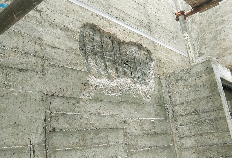 コンクリートの浮き。建物東側の外壁に見られ、浮いた部分を撤去し、防さび処理後のモルタルで補修した