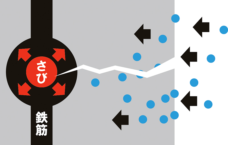 鉄筋コンクリートの劣化メカニズム。ひび割れから水や酸素などが浸入することで、鉄筋がさびて膨張。内側から破壊する