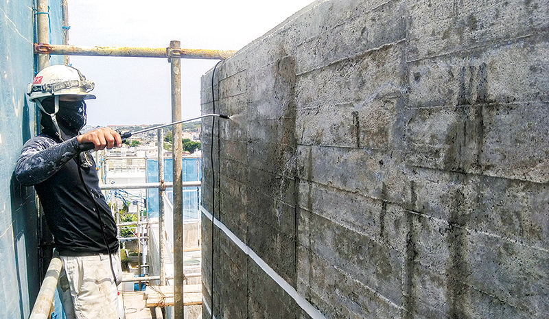補修にあたり、真喜志さんは鉄筋腐食を抑制しつつ、美観も損なわない方法を模索。目を付けたのが「表面含浸材」=下記詳細=だ。「国の重要文化財保全だけではなく、沖縄県建築士会もRC造の補修法として使用していたため、自宅の工事でも使ってみようと思いました」と振り返る。