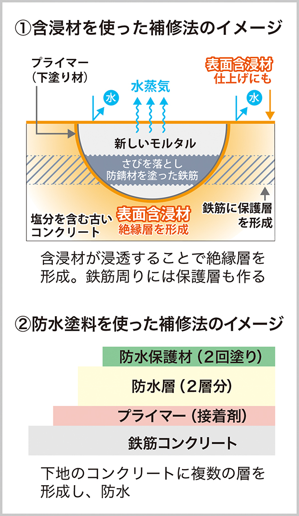 てんtoてんの防水処理で使ったのが表面含浸材「プロテクトシル」だ。県内では今帰仁村中央公民館の補修などに使われた。販売元であるシーカジャパン(株)の太田純一朗さんは「含浸材を吹き付けることで、鉄筋抑制成分が浸透し、さびにくい環境をつくります」と説明する=図①。