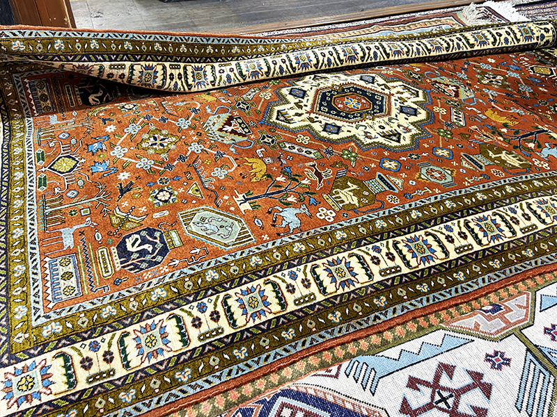 買い付け旅では、どこの街でもアルダビールのラグを探しているが、数が少なく良い出逢(あ)いがなかった。しかし、アルダビールのバザールのラグ店で、とっておきの1枚に出逢った。パッと目の前に広げられた瞬間に一目ぼれした落ち着いたオレンジのラグは、たくさんの動物や鳥たちが織り込まれ、楽園のよう。本当は「かわいい!」と小躍りしたかったが、店主の前ではポーカーフェースが買い付けの鉄則。うれしさが顔に出ていたかもしれないが、低めの声で「かわいいね」と言う私が動画に残っていた。