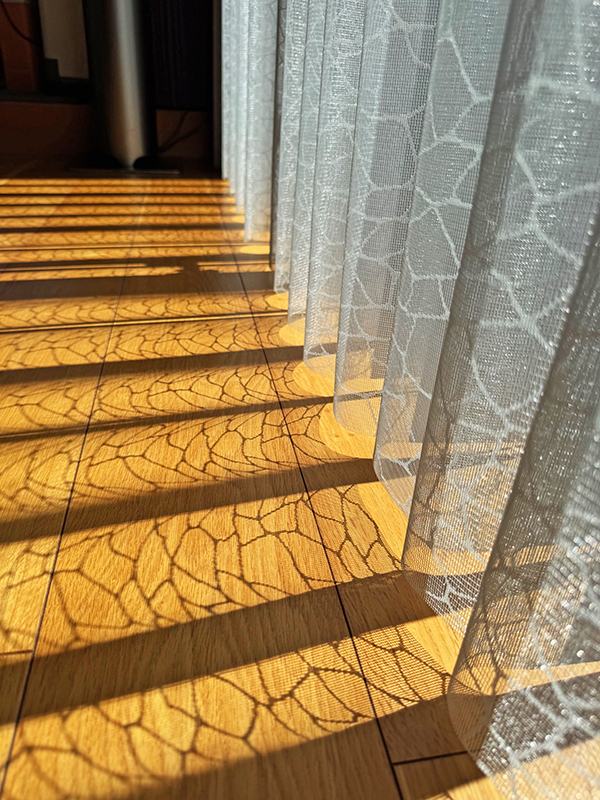 水面をイメージした「みなも柄」のスマートカーテン。陽光が透過して、床に奇麗なみなも模様が浮かび上がる