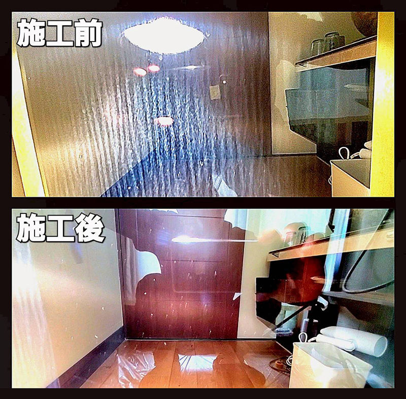 中でも研磨技術により、窓ガラスや鏡に付く水あか、傷、汚れを除去。県内で唯一の技術を生かし、「年月をへているガラスなどでも新品同様の透明度に再生できます。コスト面でも主流だった取り替え工事と比較しても、低価格を実現。住宅の窓や水回りに限らず、ホテルや商業施設、公共施設などもお任せください」と山里代表。