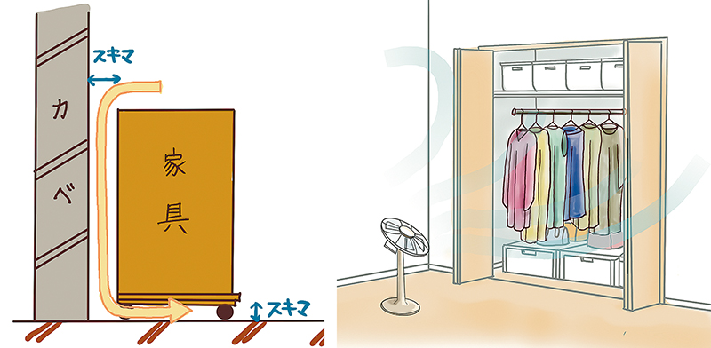 不要な衣類や紙・空き箱などのモノを減らすと、風が通りやすくなり、湿気がこもりにくくなります。そしてホコリなどを除去しましょう。
