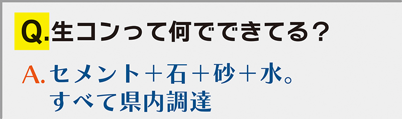 材料を練り上げたばかりの生コンは、JIS規格によって90分以内に搬入することが定められていて、鮮度が命! そのため県内には、生コンを一括受注販売する生コン協同組合が、沖縄本島、石垣島、宮古島、久米島の各地にあります。これらの組合に加盟する計50の工場で日々、生コンを製造。エリアごとに工事現場まで90分以内に配達できる体制を整えています。