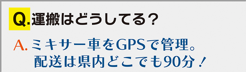 最先端の工場では、ミキサー車の位置をGPSで管理し、職員がナビゲーション。随時、交通情報とミキサー車の現在地を確認しながら、到着時刻を予測し、出荷調整を行っています。こうした連携で運搬時間を短縮。ミキサー車から排出されるCO2削減にも一役買っています。