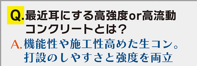 機能性や施工性を高めた生コンクリートのこと。専用の混和剤(液状)や混和材(粉状)を混ぜることで、柔らかさや粘りを出して施工性を上げつつ、固まると強度も上がるのが特徴です。特に高層マンションや複合ビル、リゾートホテルなどのように、大規模で施工に時間がかかり、複雑な形をした建物は、短時間で型枠のすみずみまでコンクリートを行き渡らせて空気を抜く「打設のしやすさ」と「強度」の両方が求められます。そのため、民間工事では高強度コンクリート、高流動コンクリートの使用が主流に。通常のコンクリートより割高になるものの、高耐久性・長寿命化が期待できます。