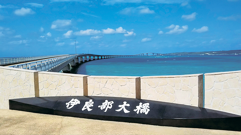 橋名の看板の後ろに延びるのが、県産のフライアッシュコンクリートを採用した初の海上橋「伊良部大橋」。全長3540メートル、通行料を徴収しない橋では日本一長い