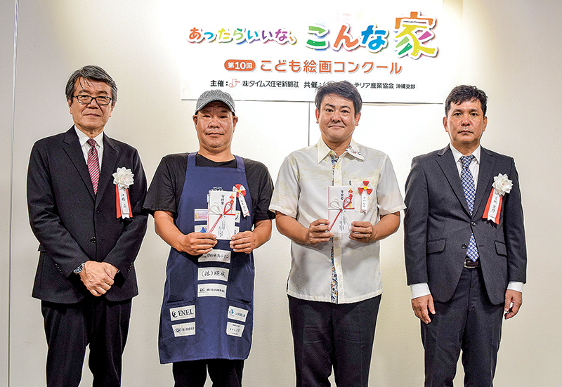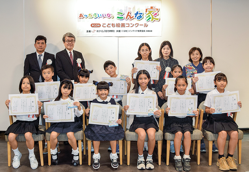 「あったらいいな、こんな家」をテーマに県内の小学生から絵を募り、優れた作品を表彰する「第10回こども絵画コンクール」(主催・タイムス住宅新聞社、共催・インテリア産業協会沖縄支部)の表彰式が15日、那覇市のタイムスビルで開かれた。293点の中から入賞者12人を表彰。19社から集まった協賛金の一部を県内の子どもを支援する2団体に寄付した。