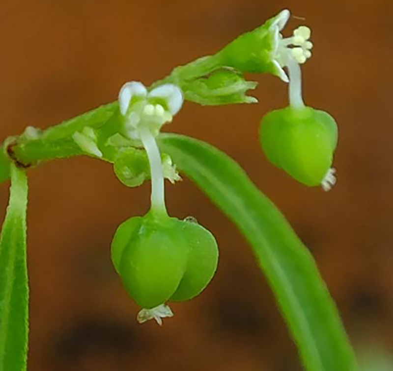 カワリバトウダイはメキシコ原産で、高さ20~70センチに成長する多年生草本です。葉は対生や互生(互い違いに付く)です。「変わり葉灯台」の名の通り、葉の形が変化します。生育当初は幅広ですが、大きくなるにつれて細長くなる傾向があります。花は小さく、そこからぶら下がるように苞(ほう)を付けます。