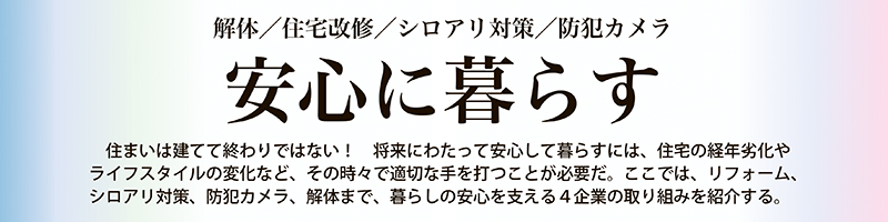 住まいは建てて終わりではない! 将来にわたって安心して暮らすには、住宅の経年劣化やライフスタイルの変化など、その時々で適切な手を打つことが必要だ。ここでは、リフォーム、シロアリ対策、防犯カメラ、解体まで、暮らしの安心を支える4企業の取り組みを紹介する。