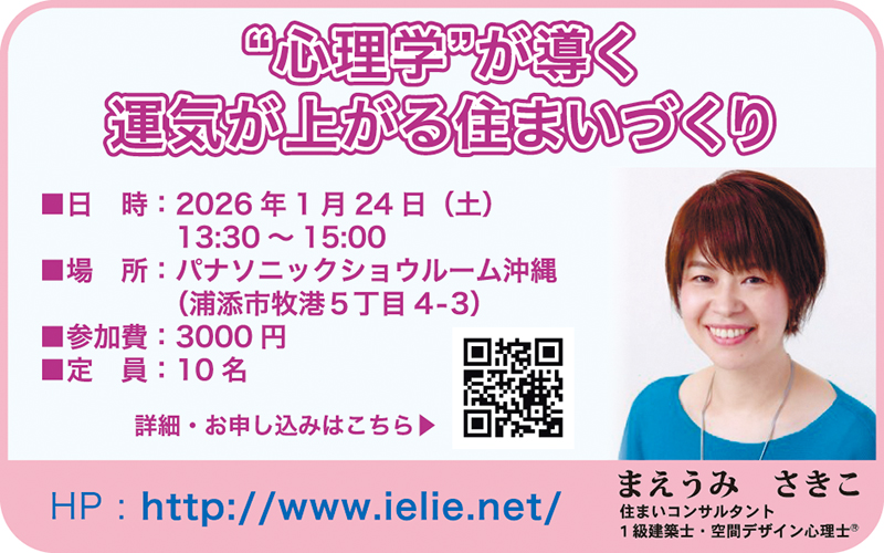 まえうみ・さきこ/1976年、嘉手納町出身。建築会社に20年勤務したのち、2021年6月に「ielie(イエリエ)」を設立。建築の知識やママの経験を生かして、住まいの悩みに応じたコンサルティングやインテリアコーディネートを行う。一級建築士、空間デザイン心理士®、夫、2人の子ども、猫2匹で暮らす。