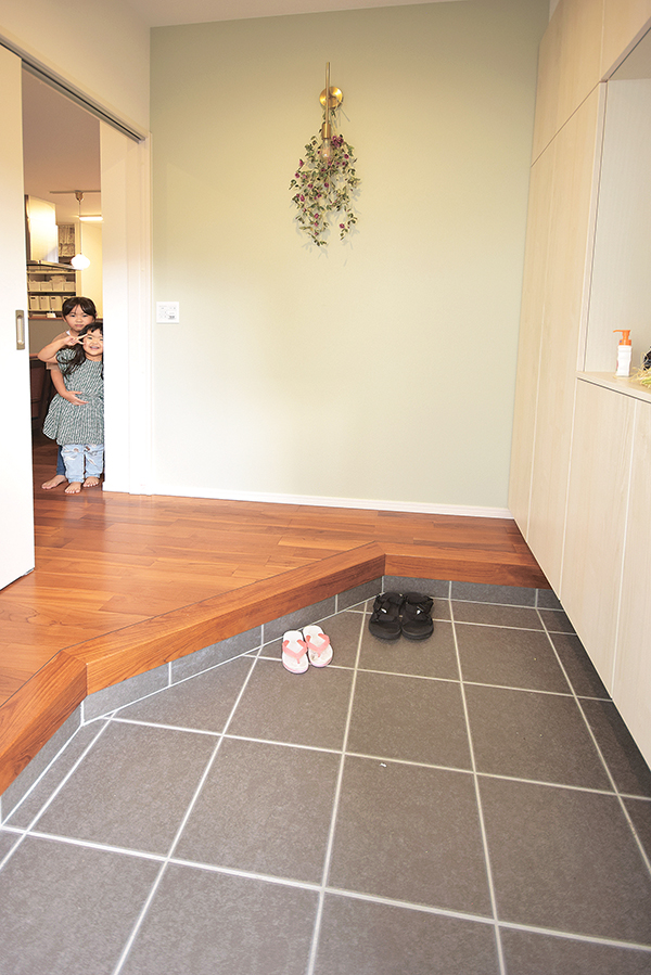 上がり框を多角形状にして、玄関とホールの面積を半分に分けた。理由は「それぞれに、車いす1台分のスペースを確保したかった」。外用・室内用と車いすを使い分けることなどを考慮。框を多角形状にしたことで「土間に下りずに玄関ドアを開けられて便利」と話す