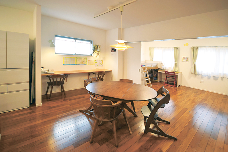 LDKは仕切りや段差がなく、一体的な空間。隣接する洋室(子ども室)とも引き戸を開ければつながる。ダイニングテーブルや造作のデスクは、車いすの肘置きも収まるよう天板下端の高さを70センチにしている