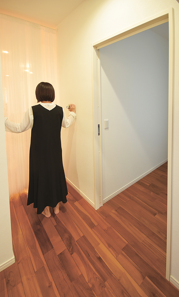 廊下の幅は85センチ。一般的な車いすの幅が55センチ〜70センチであることを踏まえた。「車いすが余裕を持って通るにはもう少し広い方がいいけれど、我が家は約30坪で、そこまで廊下に面積を割けなかった。ただ、曲がり角は広めにしています。最近は小回りの利く車いすもあるので方向転換も可能」