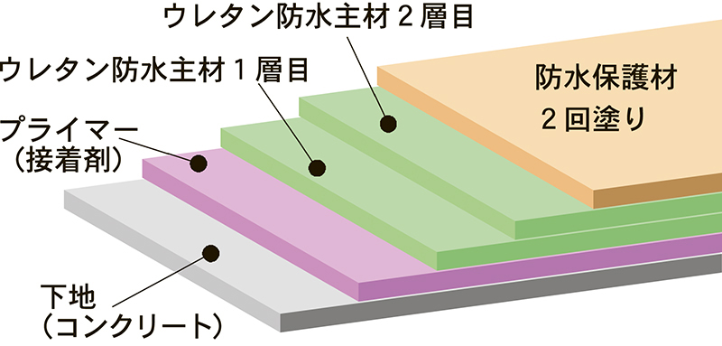 一番ノーマルなウレタン防水の断面図。コンクリート面にプライマーを塗り、ウレタン防水主材を塗り、その上に保護材(トップコート)を塗る。保護材が残っているうちに塗り直せば、そこだけの補修費用で済み、建物への影響もない