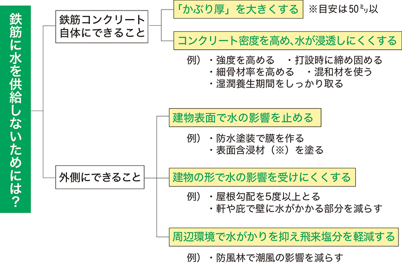 コンクリート内部に水を浸透させないために新築時からできる対策は、①鉄筋のかぶり厚さを大きくする、②コンクリート密度を高める、③建物表面で水の影響を止める、④建物の形で水の影響を受けにくくする、⑤周辺環境で水がかりを抑え、飛来塩分の影響を軽減する、の五つ=下図参照。