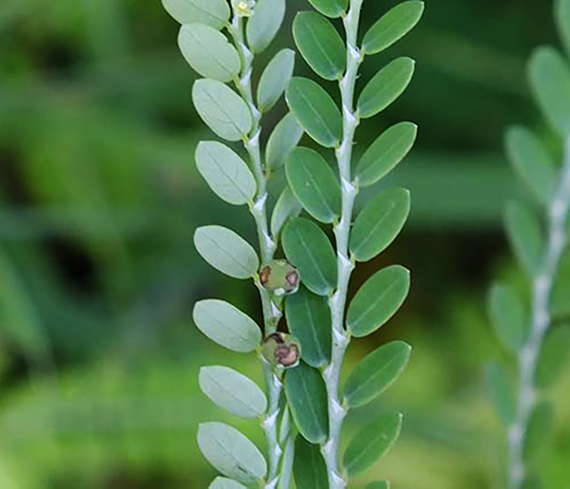 キダチコミカンソウは熱帯アメリカ原産で、高さ10~30センチに成長する1年生草本です。葉はコミカンソウと同じく四角形で長さ5~12ミリほどです。茎の一つの節から1枚ずつ左右に交互にずれてつく「互生」で、全体的に青白いのが特徴です。