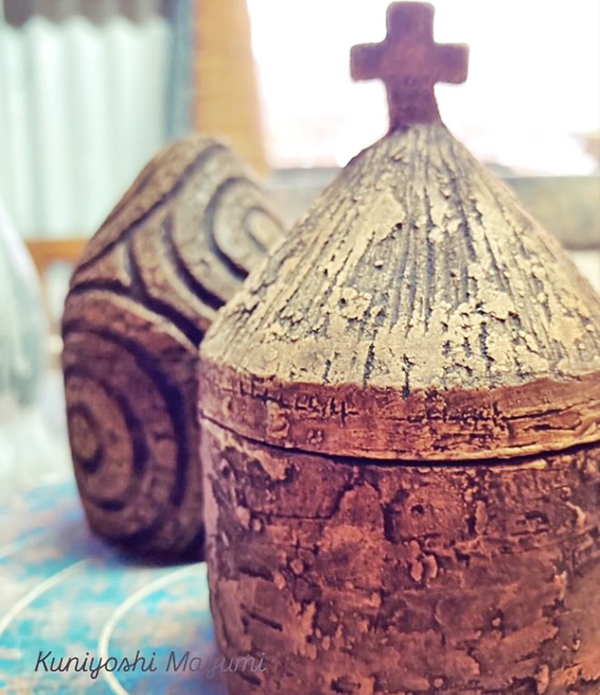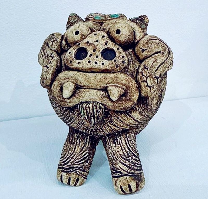 昨年11月、小禄にあるお気に入りのギャラリー&ショップ「HONNO PARK(ホンノパーク)」で陶芸作家・國吉真由美の作品を見た。独特な文様の花器、シーサー、ペット用の骨壺(つぼ)に楊枝(ようじ)入れ、ブローチにキャンドルスタンドなど、ひとつひとつの作品がそのイメージを超えた。造形のインパクト。原始的でありながら洗練されているデザイン。祈りのようなたたずまい。しばし目がとりこになった。國吉は「沖縄の赤土に含まれるマンガンを主に彩色に使い、土器のようなプリミティブな力強さと素朴さの中に遊び心のあるデザインを心がけ、古さと新しさや素朴さと華やかさ、繊細さと大胆さのように相反するものが共存する作品」を目指しているという。