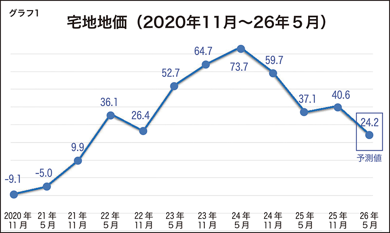 昨年11月1日時点の地価動向DIは住宅地が40.6で9期連続=グラフ1参照、商業地が40.5で8期連続のプラスを維持し、市場の景況感の上昇が続いている。一方、軍用地はマイナス71.3で12期連続のマイナスと、下落傾向が依然と続いている。