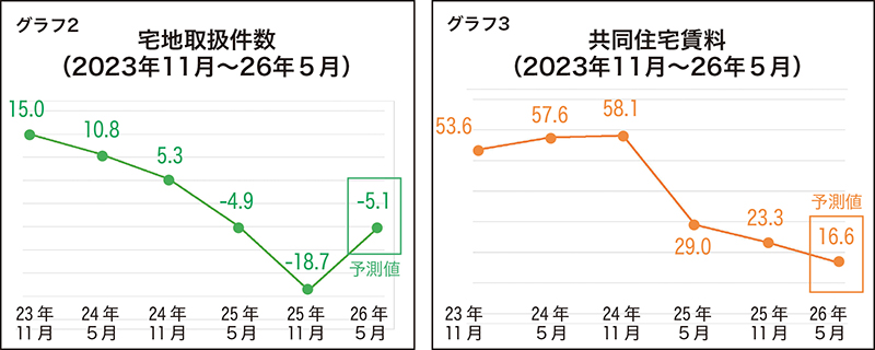 [グラフ2]25年5月のレポートよりも、さらに下落。半年後の予測値は本島北部と先島地区を除く6エリアで、1〜36ポイント程度の上昇が見られ、下落感は和らぐとの見通し