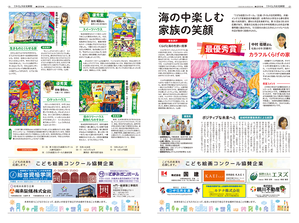 | 01-06P | [第10回こども絵画コンクール] ・沖縄の小学生が画用紙に「建てた」夢の家 応募総数293点から最優秀賞に選ばれた作品は ・きょうりゅうやパイナップルがモチーフ 最優秀賞・優秀賞以外の個性豊かな入賞作品8点 ・入選者は168人! 第10回こども絵画コンクール・入選者一覧名簿 ・【協賛企業の紹介】第10回こども絵画コンクール[こどもの未来を応援します] |