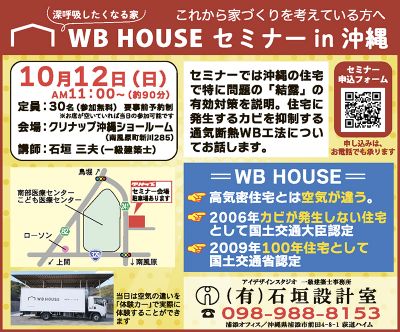 【タグ検索】カビ対策1件表示しています。 すべて見る住宅見学会オープンハウス住まいに関する相談会・見学会セミナー・講座フェア暮らしのイベント商品紹介販売 終了 セミナー・講座 [クリナップ沖縄ショールーム]WB HOUSEセミナーin沖縄|有限会社 石垣設計室 これから家づくりを考えている方へ【カテゴリ|セミナー】