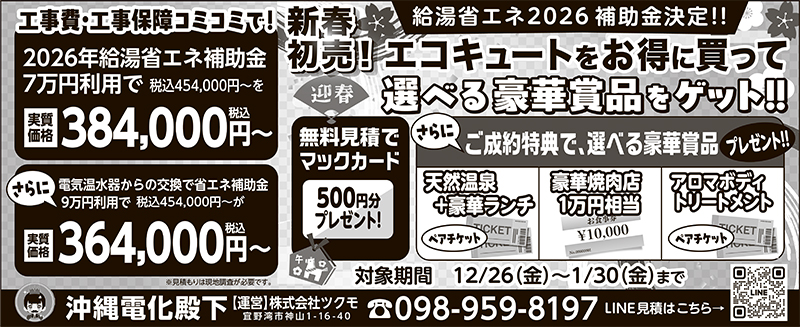[宜野湾市神山]給湯省エネ2026 補助金決定!!|沖縄家電殿下[運営:株式会社 ツクモ]