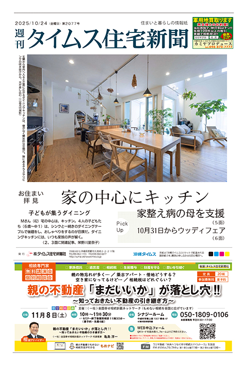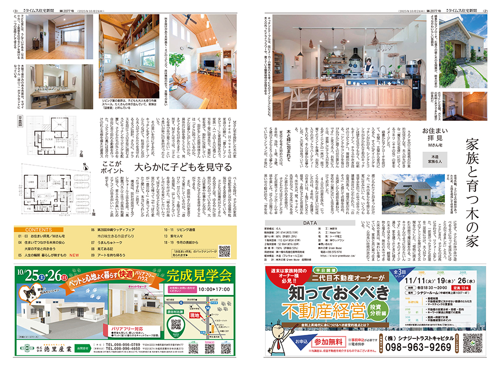 | 18-19P | [今月の表紙から 2025年10月] ①築15年、沖縄の建築家の自宅兼事務所 リノベーションで愛着のあるモノや家具を生かす|10月3日号・金城豊さん宅「痕跡と記憶を刻む家」 ②建築家・嶋田洋平さんがリノベーション 沖縄の築50年マンション 「非日常空間」を醸す仕掛け|10月10日号・嶋田洋平さんのセカンドハウス「跡や廃材で魅せる非日常」 ③築4年の木の家 深みのある無垢材と照明が織りなす、温かみのある室内|10月24日号・Mさん宅「家の中心にキッチン」 |
