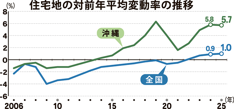 沖縄県は9月16日に、7月1日時点での県内の地価調査結果を発表した。全用途(林地を除く)の平均は12年連続で上昇し、変動率は+6.1%(前年+5.9%)で、都道府県別では全国2位。住宅地の変動率は+5.7%(前年+5.8%)で全国1位だった。