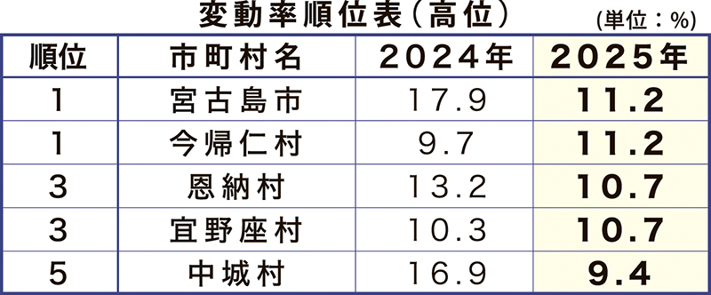 前年も今年と同様に変動率上昇1位の宮古島市は、資金力がある企業によってリゾートホテル建築が続いており、作業員や従業員向けの住宅需要のほか、移住や別荘を目的に県内外の富裕層による購入が需要を下支えしている。