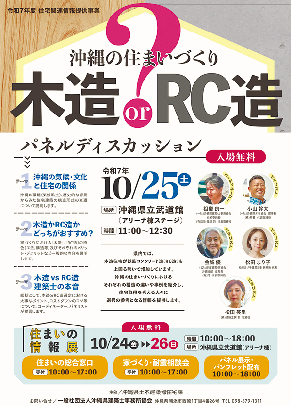 沖縄県土木建築部住宅課は10月25日(土)午前11時から、パネルディスカッション「沖縄の住まいづくり“木造 or RC造”」=写真=を那覇市の県立武道館(アリーナ棟)で開催する。参加無料。